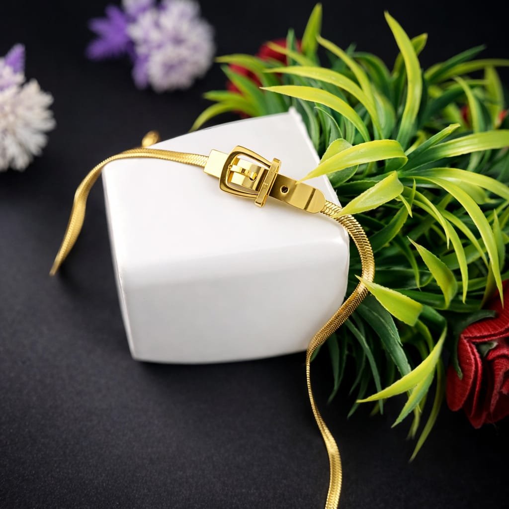 High-quality stainless steel material se bana ye bracelet anti-tarnish, rust-free aur long-lasting hai. Premium gold plating bracelet ko extra shine aur classy finish deti hai jo time ke saath dull nahi hoti. Iska strong buckle lock secure fitting ensure karta hai aur lightweight design ki wajah se ye poore din comfortable rehta hai.