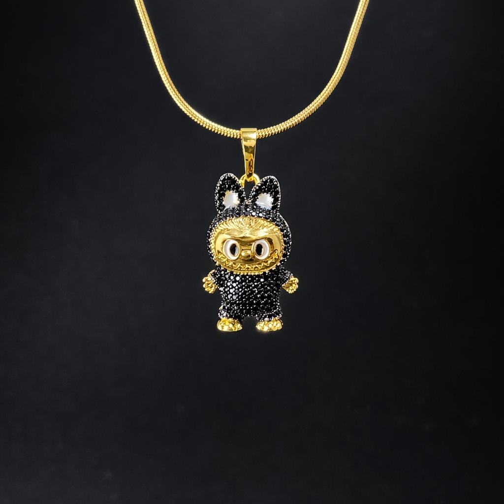 KOOBERAZ ka ye Labubu-Inspired Doll Pendant Necklace modern fashion aur cute character jewellery ka perfect combination hai. Is pendant ka iconic Labubu-style doll design black crystal detailing aur gold plated finish ke saath ek premium aur eye-catching look deta hai.